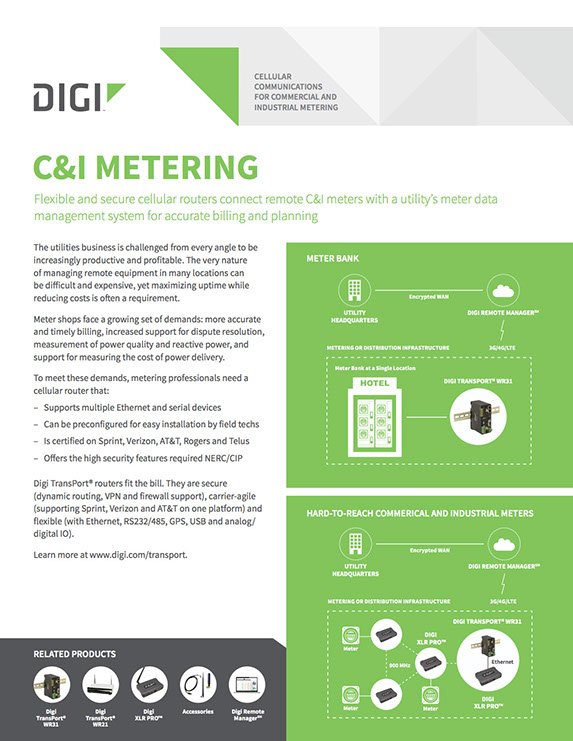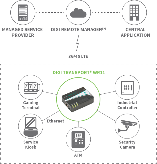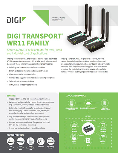 The Digi TransPort WR11 XT provides a secure, reliable connection to industrial controllers, retail terminals and process automation equipment on third party sites or remote locations. This drop-in connectivity gives operators a way to reduce the cost of downtime and service calls and also increase revenue by bringing distributed sites online faster.