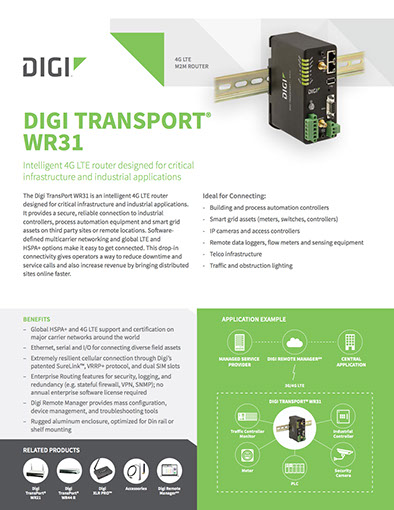 El Digi TransPort WR31 es un router inteligente 4G LTE diseñado para aplicaciones críticas industriales y de infraestructura. Proporciona una conexión segura y confiable para controladores industriales, equipos de automatización de procesos y activos de una red eléctrica inteligente en lugares remotos o en instalaciones de terceros. Opciones de Software-definido, redes multi operador, Global LTE y HSPA+ hacen más fácil estar conectado. Esta pérdida de conectividad da a los operadores una manera de reducir los tiempos de inactividad y las llamadas de Servicio, también se incrementan los ingresos por traer ubicaciones distribuidas en línea más rápidamente.