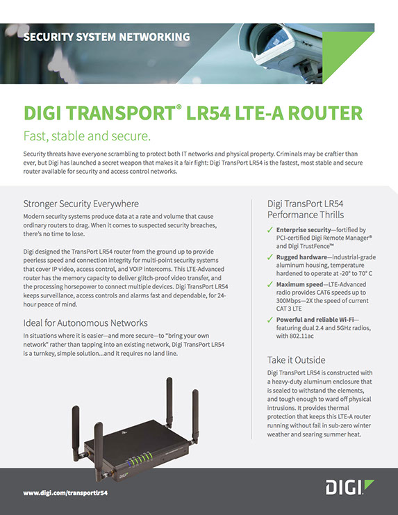 It’s time to re-set your managed networking services expectations for distributed site, retail and security systems. The Digi TransPort LR54 is an LTE-Advanced (LTE-A) router, designed from the ground up to provide peerless speed and connection integrity – so that you can deliver remarkable customer experiences.
